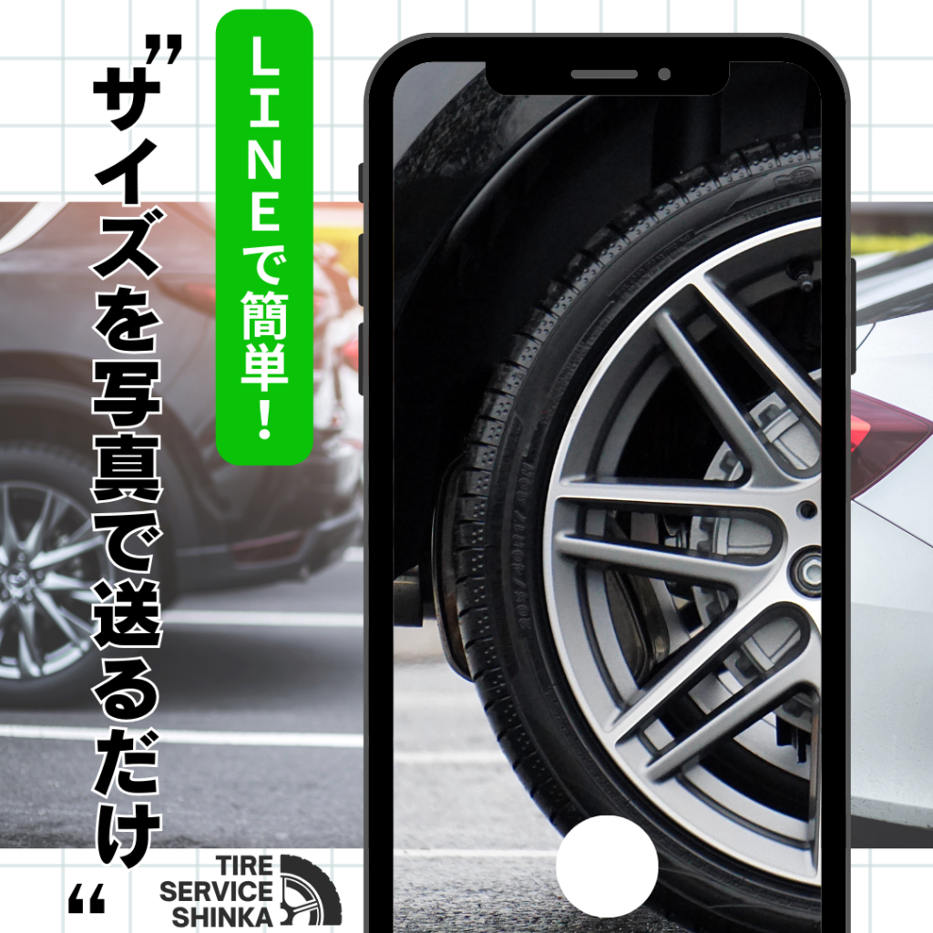 LINEでタイヤの写真(225/45R18のような数字が写るように)を送るだけで、最短日程と料金をご案内。当日はご自宅で待つだけでスタッドレスタイヤへ交換できます。